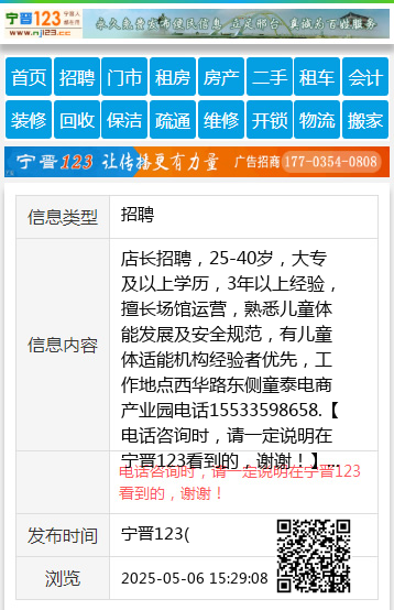 店长招聘,25-40岁,大专及以上学历,3年以上经验,擅长场馆运营,熟悉儿童体能发展及安全规范,有儿童体适能机构经验者优先,工作地点西华路东侧童泰电商产业园电话15533598658. 【电话咨询时,请一定说明在宁晋123看到的,谢谢!】 |