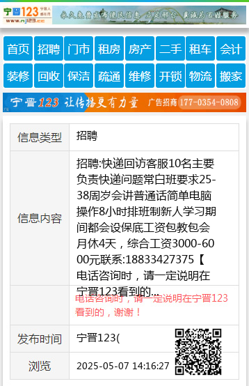 招聘:快递回访客服10名主要负责快递问题常白班要求25-38周岁会讲普通话简单电脑操作8小时排班制新人学习期间都会设保底工资包教包会月休4天,综合工资3000-6000元联系:18833427375 【电话咨询时,请一定说明在宁晋123看到的,谢谢!】 |