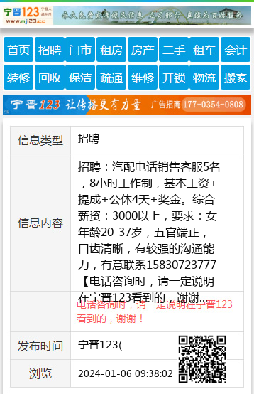 招聘:汽配电话销售客服5名,8小时工作制,基本工资+提成+公休4天+奖金。综合薪资:3000以上,要求:女年龄20-37岁,五官端正,口齿清晰,有较强的沟通能力,有意联系15830723777 【电话咨询时,请一定说明在宁晋123看到的,谢谢!】 |