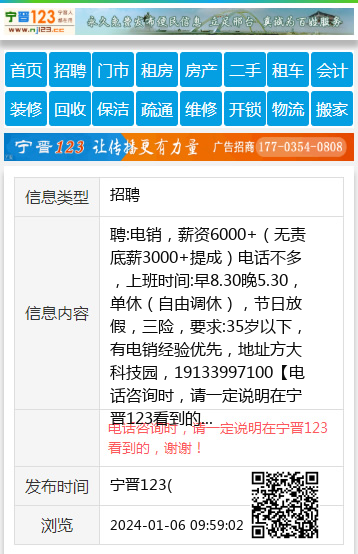 聘:电销,薪资6000+(无责底薪3000+提成)电话不多,上班时间:早8.30晚5.30,单休(自由调休),节日放假,三险,要求:35岁以下,有电销经验优先,地址方大科技园,19133997100 【电话咨询时,请一定说明在宁晋123看到的,谢谢!】 |