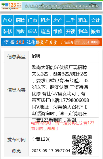 欧尚太阳能光伏板厂现招聘文员2名,财务3名/统计2名,要求已婚已育.有经验、35岁以下、踏实认真.工资待遇优厚.有社保/男女均可,有意可拨打电话:17798006098同V地址:河渠镇大召村* 【电话咨询时,请一定说明在宁晋123看到的,谢谢!】 |