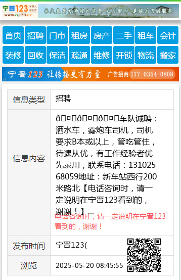 🤙🤙🤙车队诚聘:洒水车,雾炮车司机,司机要求B本或以上,管吃管住,待遇从优,有工作经验者优先录用,联系电话:13102568059地址:新车站西行200米路北 【电话咨询时,请一定说明在宁晋123看到的,谢谢!】 |