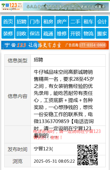 牛仔城品味空间高薪诚聘销售精英一名,要求28至45岁之间,有女装销售经验的优先录用,能吃苦耐劳有责任心,工资底薪+提成+各种奖励,一心想挣钱的,想找一份安稳工作的联系我,电微13363709859 【电话咨询时,请一定说明在宁晋123看到的,谢谢!】 |