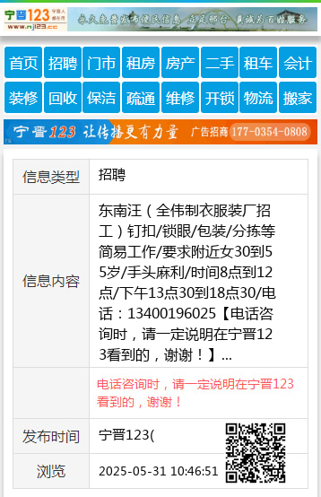 东南汪(全伟制衣服装厂招工)钉扣/锁眼/包装/分拣等简易工作/要求附近女30到55岁/手头麻利/时间8点到12点/下午13点30到18点30/电话:13400196025 【电话咨询时,请一定说明在宁晋123看到的,谢谢!】 |