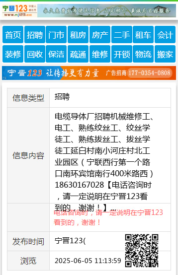 电缆导体厂招聘机械维修工、电工、熟练绞丝工、绞丝学徒工、熟练拔丝工、拔丝学徒工延白村南小河庄村北工业园区(宁联西行第一个路口南环宾馆南行400米路西)18630167028 【电话咨询时,请一定说明在宁晋123看到的,谢谢!】 |