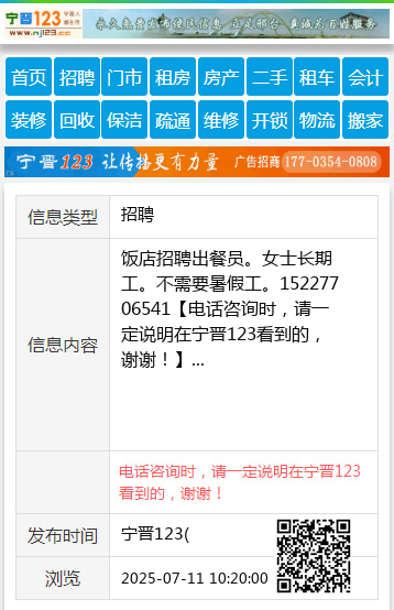 饭店招聘出餐员。女士长期工。不需要暑假工。15227706541