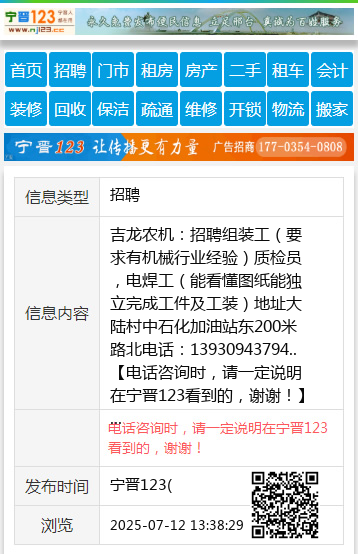 吉龙农机:招聘组装工(要求有机械行业经验)质检员,电焊工(能看懂图纸能独立完成工件及工装)地址大陆村中石化加油站东200米路北电话:13930943794.. 【电话咨询时,请一定说明在宁晋123看到的,谢谢!】 |