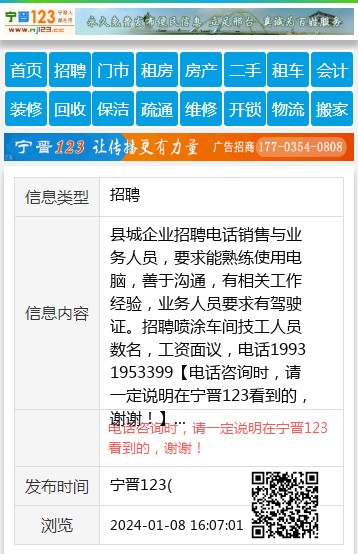县城企业招聘电话销售与业务人员,要求能熟练使用电脑,善于沟通,有相关工作经验,业务人员要求有驾驶证。招聘喷涂车间技工人员数名,工资面议,电话19931953399 【电话咨询时,请一定说明在宁晋123看到的,谢谢!】 |