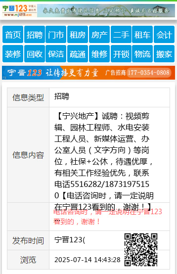 【宁兴地产】诚聘:视频剪辑、园林工程师、水电安装工程人员、新媒体运营、办公室人员(文字方向)等岗位,社保+公休,待遇优厚,有相关工作经验优先,联系电话5516282/18731975150 【电话咨询时,请一定说明在宁晋123看到的,谢谢!】 |