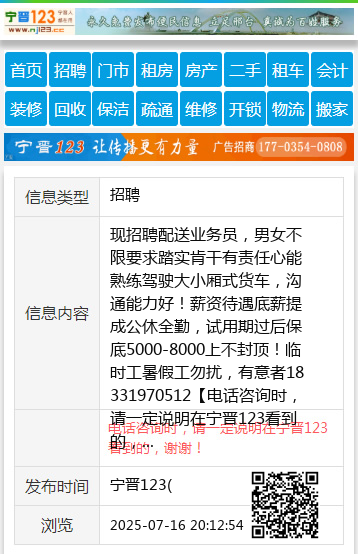 现招聘配送业务员,男女不限要求踏实肯干有责任心能熟练驾驶大小厢式货车,沟通能力好!薪资待遇底薪提成公休全勤,试用期过后保底5000-8000上不封顶!临时工暑假工勿扰,有意者18331970512 【电话咨询时,请一定说明在宁晋123看到的,谢谢!】 |