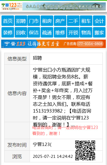 宁晋出口小方瓶酒因扩大规模,现招聘业务员8名。薪资待遇优厚,底薪+提成+餐补+奖金+年终奖,月入过万不是梦!男女不限,欢迎有志之士加入我们。联系电话15131933982; 【电话咨询时,请一定说明在宁晋123看到的,谢谢!】 |