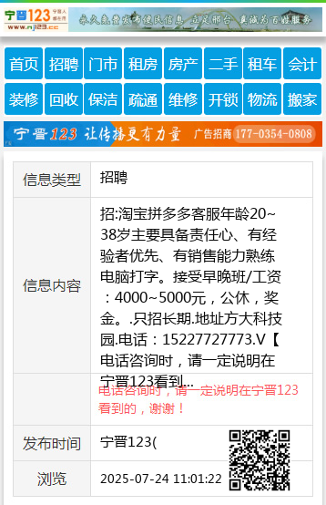 招:淘宝拼多多客服年龄20~38岁主要具备责任心、有经验者优先、有销售能力熟练电脑打字。接受早晚班/工资:4000~5000元,公休,奖金。.只招长期.地址方大科技园.电话:15227727773.V 【电话咨询时,请一定说明在宁晋123看到的,谢谢!】 |