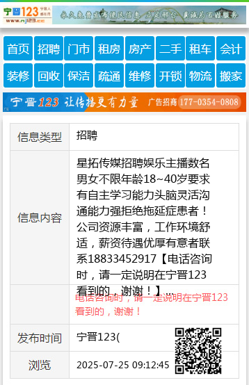 星拓传媒招聘娱乐主播数名男女不限年龄18~40岁要求有自主学习能力头脑灵活沟通能力强拒绝拖延症患者!公司资源丰富,工作环境舒适,薪资待遇优厚有意者联系18833452917 【电话咨询时,请一定说明在宁晋123看到的,谢谢!】 |