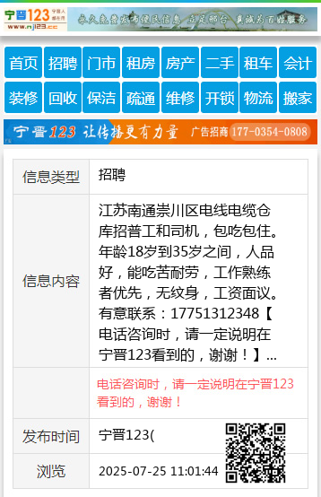 江苏南通崇川区电线电缆仓库招普工和司机,包吃包住。年龄18岁到35岁之间,人品好,能吃苦耐劳,工作熟练者优先,无纹身,工资面议。有意联系:17751312348 【电话咨询时,请一定说明在宁晋123看到的,谢谢!】 |