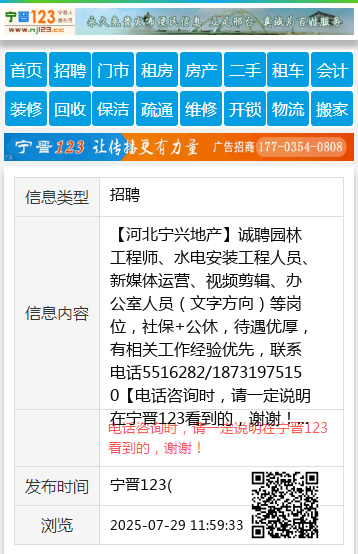 【河北宁兴地产】诚聘园林工程师、水电安装工程人员、新媒体运营、视频剪辑、办公室人员(文字方向)等岗位,社保+公休,待遇优厚,有相关工作经验优先,联系电话5516282/18731975150 【电话咨询时,请一定说明在宁晋123看到的,谢谢!】 |