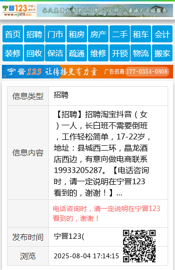 【招聘】招聘淘宝抖音(女)一人,长白班不需要倒班,工作轻松简单,17-22岁,地址:县城西二环,晶龙酒店西边,有意向做电商联系19933205287。 【电话咨询时,请一定说明在宁晋123看到的,谢谢!】 |