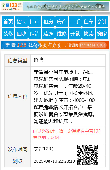 宁晋县小河庄电缆工厂组建电缆销售团队现招聘:电话电缆销售若干,年龄20-40岁,优先男士(可接受外地出差地推)底薪:4000-10000+提成。
