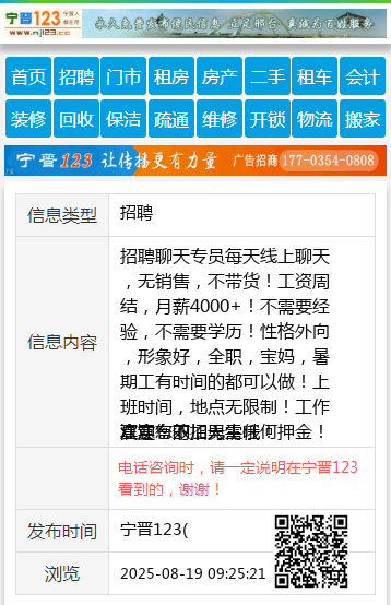 招聘聊天专员每天线上聊天,无销售,不带货!工资周结,月薪4000+!不需要经验,不需要学历!性格外向,形象好,全职,宝妈,暑期工有时间的都可以做!上班时间,地点无限制!工作真实有效,无需任何押金!