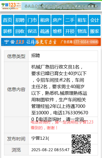 机械厂急招行政文员1名,要求已婚已育女士40岁以下,令招车间技术2名,车间主任2名,要求男士40周岁以下,熟悉机.械原理熟练运用制图软件,生产车间相关管理经验2年以上待遇7000至10000,电话17633096700 【电话咨询时,请一定说明在宁晋123看到的,谢谢!】 |