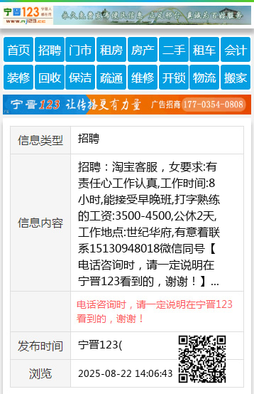 招聘:淘宝客服,女要求:有责任心工作认真,工作时间:8小时,能接受早晚班,打字熟练的工资:3500-4500,公休2天,工作地点:世纪华府,有意着联系15130948018微信同号 【电话咨询时,请一定说明在宁晋123看到的,谢谢!】 |