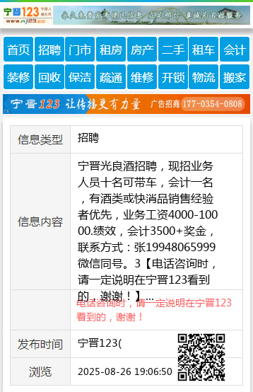 宁晋光良酒招聘,现招业务人员十名可带车,会计一名,有酒类或快消品销售经验者优先,业务工资4000-10000.绩效,会计3500+奖金,联系方式:张19948065999微信同号。3 【电话咨询时,请一定说明在宁晋123看到的,谢谢!】 |
