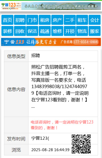 照松广告招聘裁剪工两名,抖音主播一名,打单一名,写真排版一名要求女,电话13483998038/13247440979 【电话咨询时,请一定说明在宁晋123看到的,谢谢!】 |