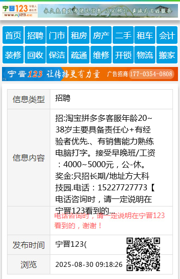 招:淘宝拼多多客服年龄20~38岁主要具备责任心+有经验者优先.、有销售能力熟练电脑打字。接受早晚班/工资:4000~5000元,公-休。奖金:只招长期/地址方大科技园.电话:15227727773 【电话咨询时,请一定说明在宁晋123看到的,谢谢!】 |