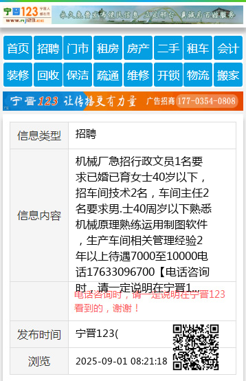 机械厂急招行政文员1名要求已婚已育女士40岁以下,招车间技术2名,车间主任2名要求男.士40周岁以下熟悉机械原理熟练运用制图软件,生产车间相关管理经验2年以上待遇7000至10000电话17633096700 【电话咨询时,请一定说明在宁晋123看到的,谢谢!】 |