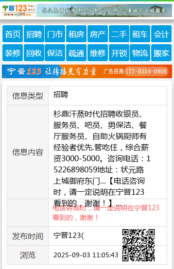 杉鼎汗蒸时代招聘收银员、服务员、吧员、男保洁、餐厅服务员、自助火锅厨师有经验者优先.管吃住,综合薪资3000-5000。咨询电话:15226898059地址:状元路上城御府东门... 【电话咨询时,请一定说明在宁晋123看到的,谢谢!】 |