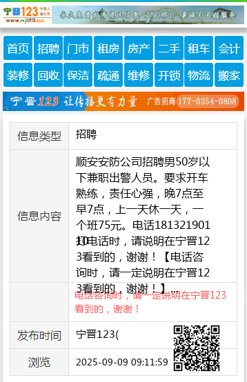 顺安安防公司招聘男50岁以下兼职出警人员。要求开车熟练,责任心强,晚7点至早7点,上一天休一天,一个班75元。电话18132190110