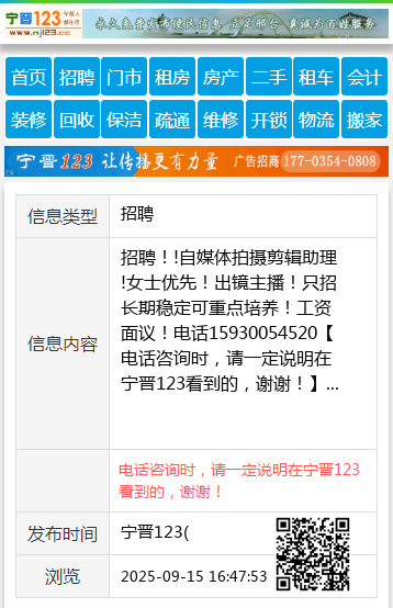 招聘!!自媒体拍摄剪辑助理!女士优先!出镜主播!只招长期稳定可重点培养!工资面议!电话15930054520