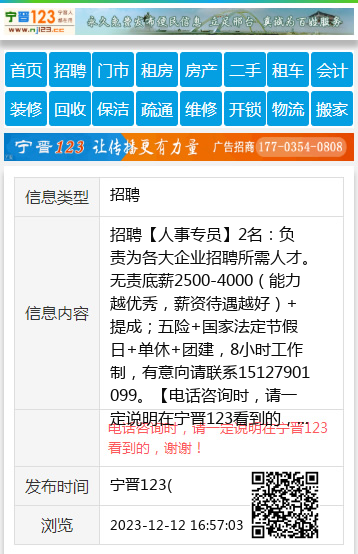 招聘【人事专员】2名:负责为各大企业招聘所需人才。无责底薪2500-4000(能力越优秀,薪资待遇越好)+提成;五险+国家法定节假日+单休+团建,8小时工作制,有意向请联系15127901099。 【电话咨询时,请一定说明在宁晋123看到的,谢谢!】 |