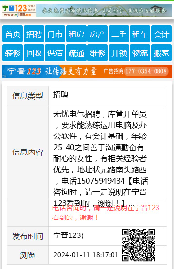 无忧电气招聘,库管开单员,要求能熟练运用电脑及办公软件,有会计基础,年龄25-40之间善于沟通勤奋有耐心的女性,有相关经验者优先,地址状元路南头路西,电话15075949434 【电话咨询时,请一定说明在宁晋123看到的,谢谢!】 |