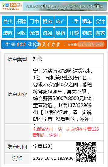 宁晋兴澳商贸招聘:送货司机1名,司机兼职业务员1名,要求25岁到40岁之间,能熟练驾驶包厢车,男女不限,综合薪资5000到8000元地址童泰附近,电话13733296941 【电话咨询时,请一定说明在宁晋123看到的,谢谢!】 |