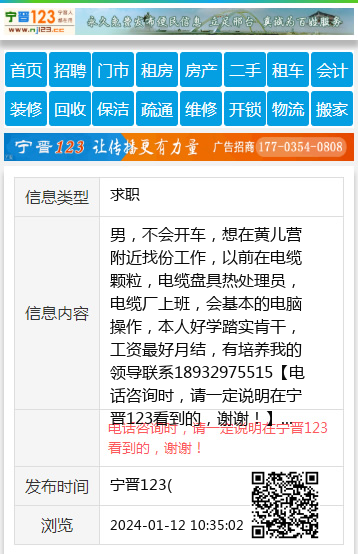 男,不会开车,想在黄儿营附近找份工作,以前在电缆颗粒,电缆盘具热处理员,电缆厂上班,会基本的电脑操作,本人好学踏实肯干,工资最好月结,有培养我的领导联系18932975515 【电话咨询时,请一定说明在宁晋123看到的,谢谢!】 |
