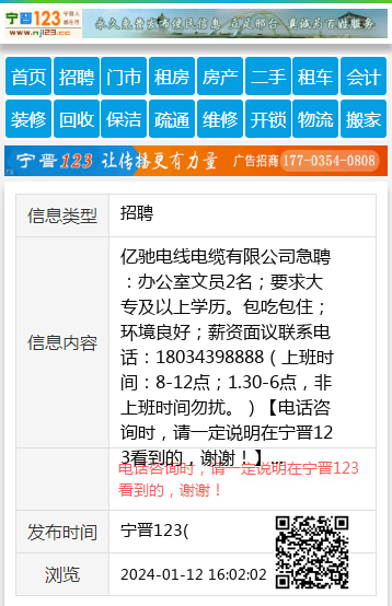 亿驰电线电缆有限公司急聘:办公室文员2名;要求大专及以上学历。包吃包住;环境良好;薪资面议联系电话:18034398888(上班时间:8-12点;1.30-6点,非上班时间勿扰。) 【电话咨询时,请一定说明在宁晋123看到的,谢谢!】 |