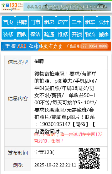 得物寄拍兼职!要求/有简单的拍照、p图能力/手机即可/平时爱拍照/年满18周岁/男女不限/薪资/一单收益50~100不等/每天可接单5~10单/要求长期兼职/无需坐班/会拍照片/能简单p图片!联系:19030195147【同微】 【电话咨询时,请一定说明在宁晋123看到的,谢谢!】 |