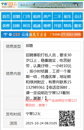 招聘兼职打包人员,要求30岁以上,稳重踏实,吃苦耐劳,认真仔细,一小时10元,按小时结算,工资一个星期一结,待遇优厚,地址颐和绿洲附近,有意向联系15132989361 【电话咨询时,请一定说明在宁晋123看到的,谢谢!】 |