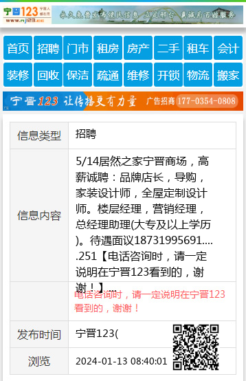 5/14居然之家宁晋商场,高薪诚聘:品牌店长,导购,家装设计师,全屋定制设计师。楼层经理,营销经理,总经理助理(大专及以上学历)。待遇面议18731995691.....251 【电话咨询时,请一定说明在宁晋123看到的,谢谢!】 |