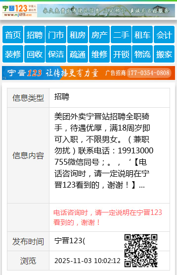 美团外卖宁晋站招聘全职骑手,待遇优厚,满18周岁即可入职,不限男女。(兼职勿扰)联系电话:19913000755微信同号;。,‘ 【电话咨询时,请一定说明在宁晋123看到的,谢谢!】 |