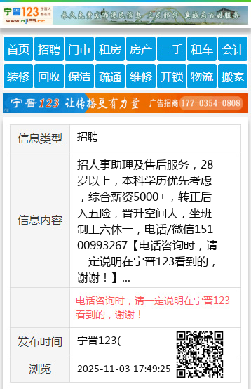 招人事助理及售后服务,28岁以上,本科学历优先考虑,综合薪资5000+,转正后入五险,晋升空间大,坐班制上六休一,电话/微信15100993267 【电话咨询时,请一定说明在宁晋123看到的,谢谢!】 |