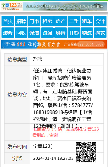 伯达集团诚聘:伯达铜业贾家口二号库招聘库房管理员1名,要求:能熟练驾驶车辆,有一定电脑基础,薪资面谈,地址:贾家口镇泰安路西邻。联系电话:5784777/18831998918杨经理 【电话咨询时,请一定说明在宁晋123看到的,谢谢!】 |