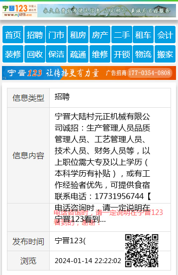 宁晋大陆村元正机械有限公司诚招:生产管理人员品质管理人员、工艺管理人员、技术人员、财务人员等,以上职位需大专及以上学历(本科学历有补贴),或有工作经验者优先,可提供食宿联系电话:17731956744 【电话咨询时,请一定说明在宁晋123看到的,谢谢!】 |