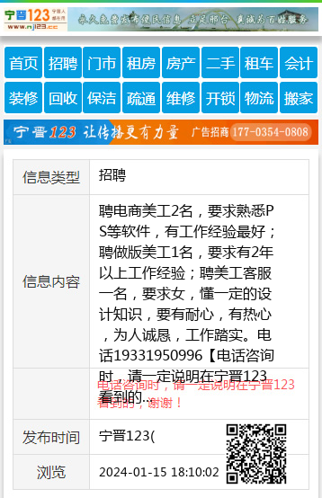 聘电商美工2名,要求熟悉PS等软件,有工作经验最好;聘做版美工1名,要求有2年以上工作经验;聘美工客服一名,要求女,懂一定的设计知识,要有耐心,有热心,为人诚恳,工作踏实。电话19331950996 【电话咨询时,请一定说明在宁晋123看到的,谢谢!】 |