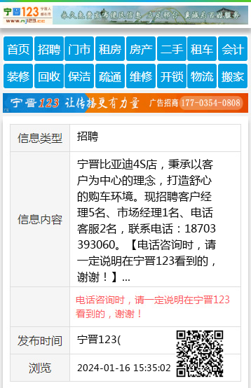宁晋比亚迪4S店,秉承以客户为中心的理念,打造舒心的购车环境。现招聘客户经理5名、市场经理1名、电话客服2名,联系电话:18703393060。 【电话咨询时,请一定说明在宁晋123看到的,谢谢!】 |