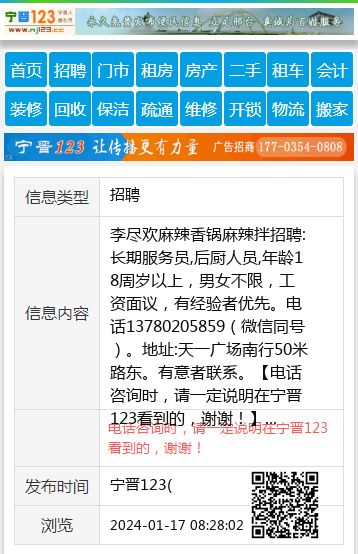 李尽欢麻辣香锅麻辣拌招聘:长期服务员,后厨人员,年龄18周岁以上,男女不限,工资面议,有经验者优先。电话13780205859(微信同号)。地址:天一广场南行50米路东。有意者联系。 【电话咨询时,请一定说明在宁晋123看到的,谢谢!】 |