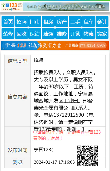 招质检员2人,文职人员3人。大专及以上学历,男女不限,年龄30岁以下,工资,待遇面议,工作地址,宁晋县城西城开发区工业园。邢台鑫光金属有限公司联系人。张、电话13722912590 【电话咨询时,请一定说明在宁晋123看到的,谢谢!】 |