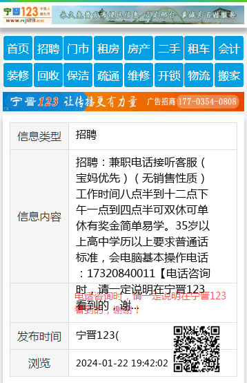 招聘:兼职电话接听客服(宝妈优先)(无销售性质)工作时间八点半到十二点下午一点到四点半可双休可单休有奖金简单易学。35岁以上高中学历以上要求普通话标准,会电脑基本操作电话:17320840011 【电话咨询时,请一定说明在宁晋123看到的,谢谢!】 |