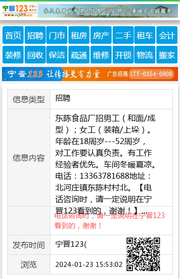 东陈食品厂招男工(和面/成型);女工(装箱/上垛)。年龄在18周岁---52周岁,对工作要认真负责。有工作经验者优先。车间冬暖夏凉。电话:13363781688地址:北河庄镇东陈村村北。 【电话咨询时,请一定说明在宁晋123看到的,谢谢!】 |