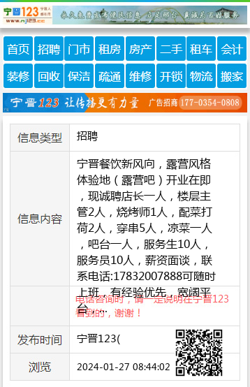 宁晋餐饮新风向,露营风格体验地(露营吧)开业在即,现诚聘店长一人,楼层主管2人,烧烤师1人,配菜打荷2人,穿串5人,凉菜一人,吧台一人,服务生10人,服务员10人,薪资面谈,联系电话:17832007888可随时上班,有经验优先,宽阔平台,共同成长! 【电话咨询时,请一定说明在宁晋123看到的,谢谢!】 |